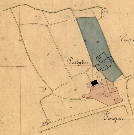 Extrait du cadastre ancien de la commune de Lanvellec, 1848 : le Presbytère. En noir : maisonImmatriculation