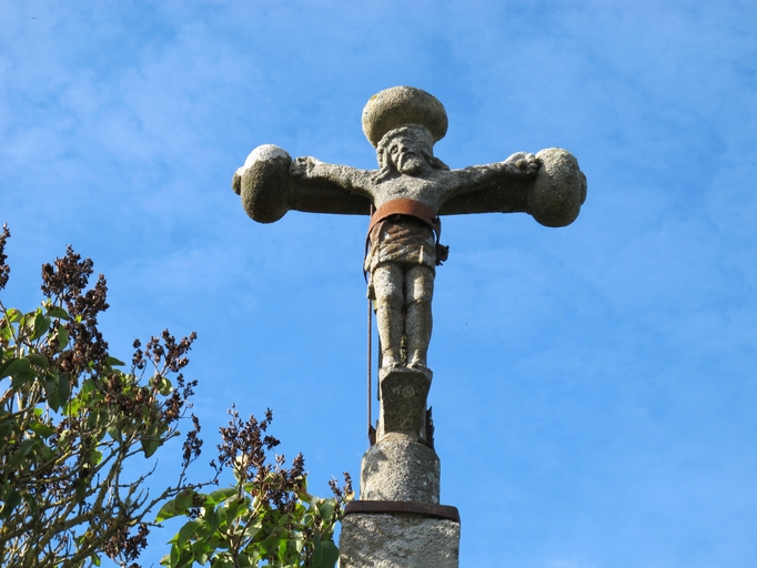 Lanvellec, Lichevan : croix de chemin, Christ en croix sculpté en haut-reliefImmatriculation
