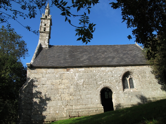 Lanvellec, Saint-Goulven : chapelle, élévation sud percé d'une porte en plein cintre et d'une baie à remplage de pierreImmatriculation
