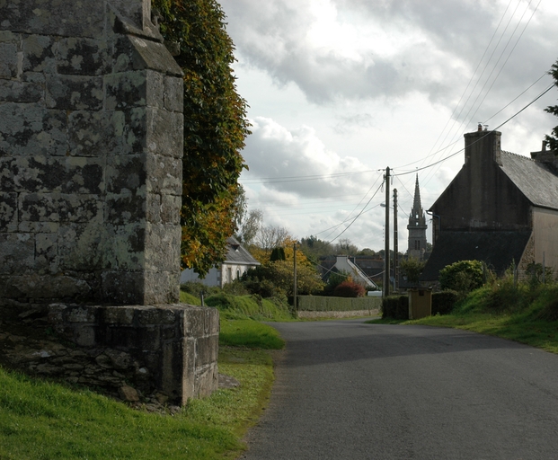 Lanvellec, Saint-Maudez : chapelle, vue de situation. En arrière-plan : clocher de l'église paroissiale Saint-BrandanImmatriculation