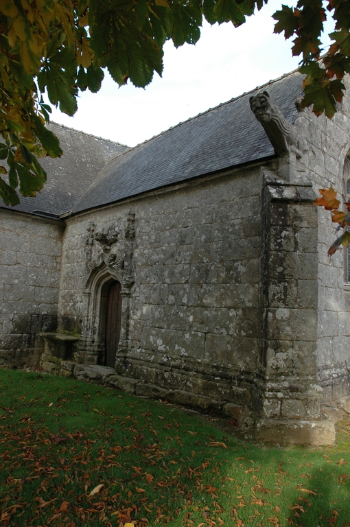 Lanvellec, Saint-Maudez : chapelle latérale au sud, porte à voussures avec arc en accolade soutenant des fleurons en croix et pinaclesImmatriculation