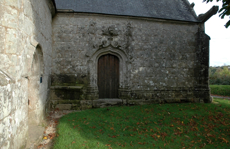 Lanvellec, Saint-Maudez : chapelle latérale au sud, porte à voussures avec arc en accolade soutenant des fleurons en croix et pinaclesImmatriculation
