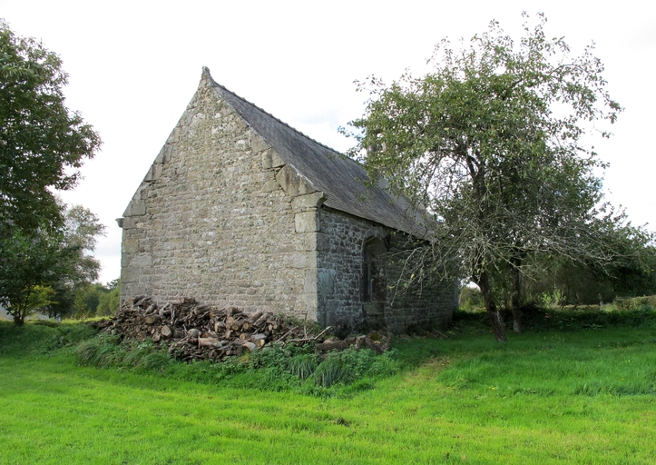 Lanvellec, Saint-Connay : chapelle depuis le nord-est, chevet plat aveugle. Pignon à rampants et crossettesImmatriculation
