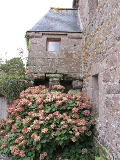 Lanvellec, Goaz Ru : manoir, élévation antérieure orientée au nord. Guérite flanquant l'angle nord-est ; elle est percée d'ouvertures de tir pour armes à feu portatives permettant une défense rapprochéeImmatriculation
