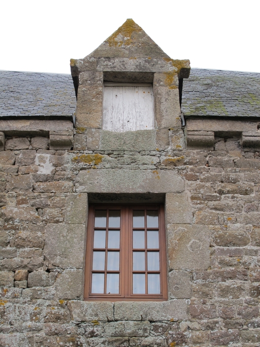 Lanvellec, Goaz Ru : manoir, élévation antérieure orientée au nord, fenêtre rectangulaire et lucarne à fronton-pignon triangulaireImmatriculation