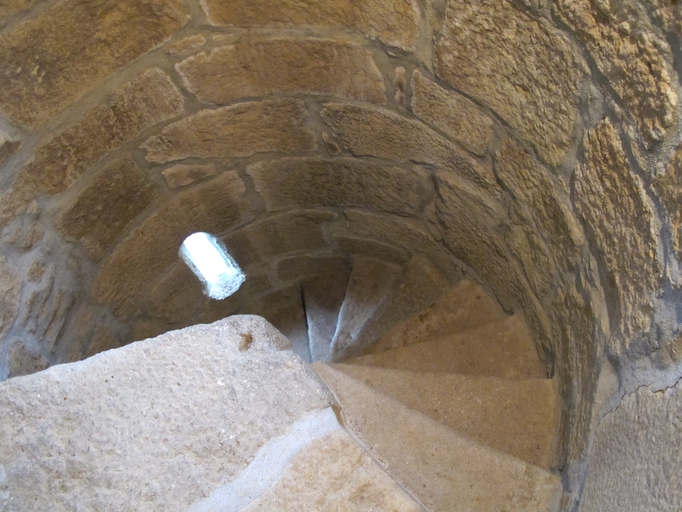 Lanvellec, Goaz Ru : manoir, vue intérieure, escalier en vis secondaire donnant accès à la pièce hauteImmatriculation