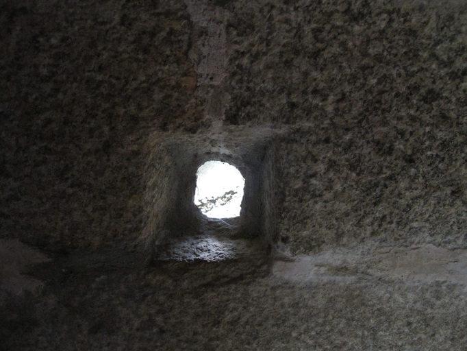 Lanvellec, Goaz Ru : manoir, vue intérieure, guérite flanquant l'angle nord-est ; ouverture de tir pour armes à feu portatives permettant une défense rapprochéeImmatriculation