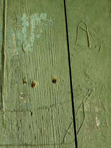 Kervéleyen, ferme, détail de graffiti sur la porte charretièreImmatriculation