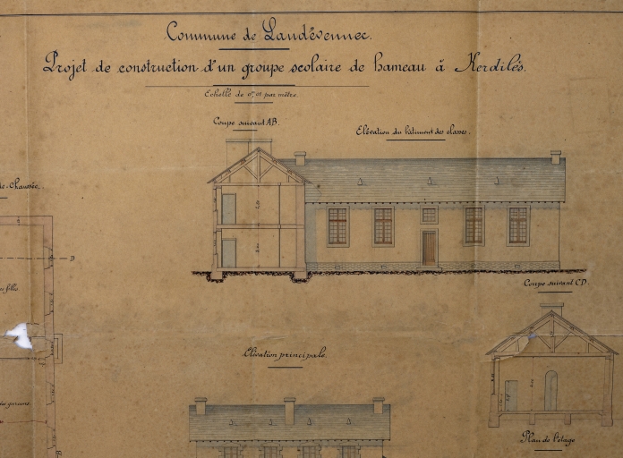 Plan de l'école de Kerdilès, élévation bâtiment des classes, détailImmatriculation