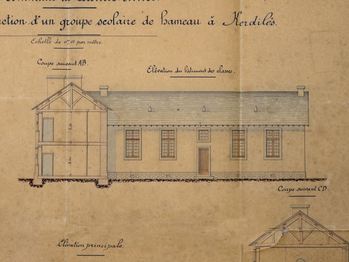 Plan de l'école de Kerdilès, élévation bâtiment des classes, détailImmatriculation