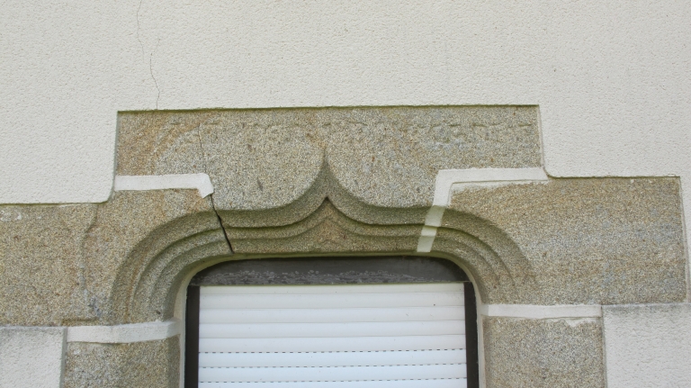 Le Lez. Ancienne maison de prêtre 1565. Détail du linteau de la porte nord avec calice sculpté en bas-relief, date et inscription illisibleImmatriculation