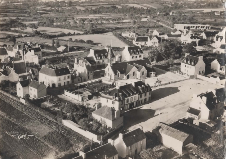 Vue aérienne sud-ouest de la place de l'église dans les années 1950. Carte postale (Collection particulière Roger Merour)Immatriculation
