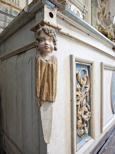 Détail de tête sculptée sur le maître autel.Immatriculation