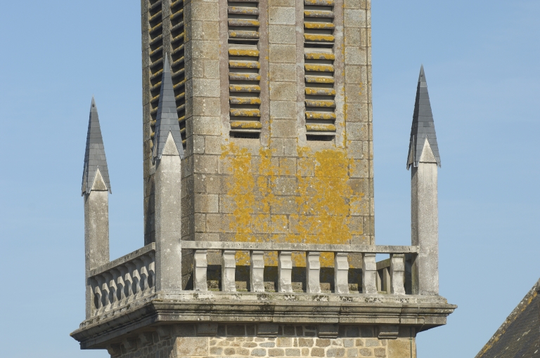 Détail du garde corps et des pinacles du clocher.Immatriculation