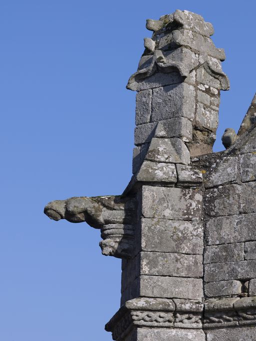 Église, élévation ouest, angle nord : gargouille sensée représenter une 'aboyeuse de Josselin' (état en 2011)Immatriculation