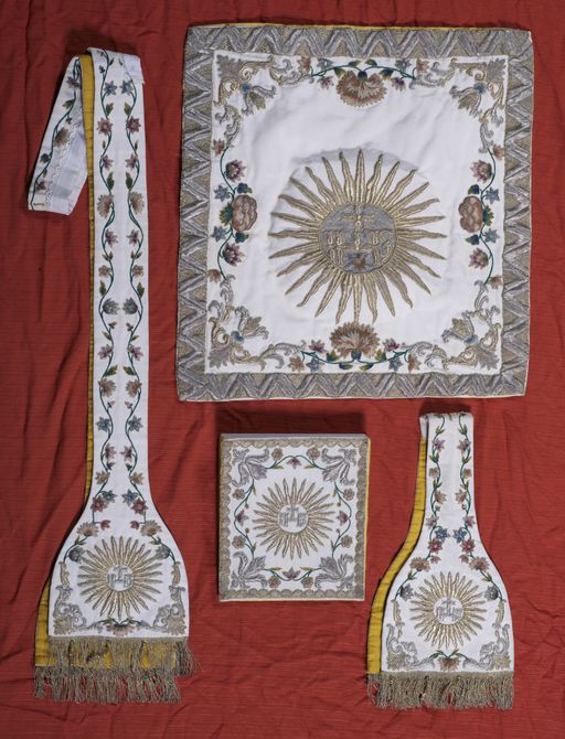 Ornement blanc : étole, voile de calice, bourse du corporal et manipule (état en 2011)Immatriculation