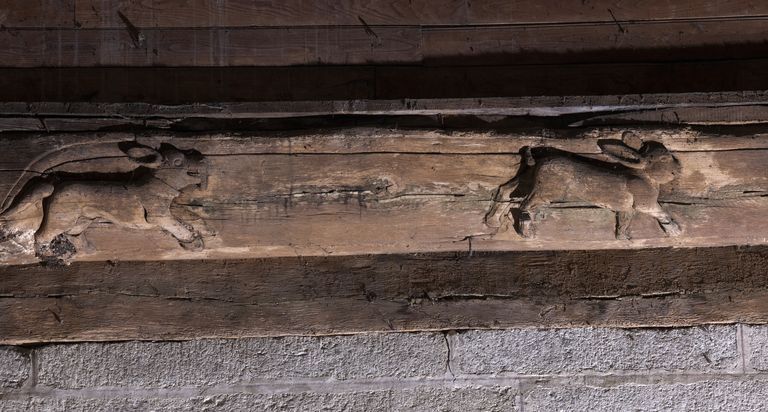 Nef, mur nord, sablière : chien courant après un lièvre (état en 2011)Immatriculation