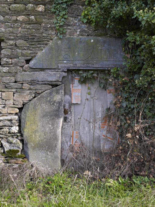 La Ruaudais, maison de prêtre : la porte (état en 2011) ; sur le linteau, on distingue un calice et un livre (?) gravésImmatriculation