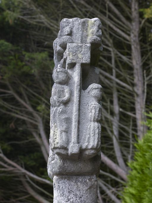 Croix de cimetière : vue latérale rapprochée montrant les personnages sur l'épaisseur de la croix (état en 2011)Immatriculation