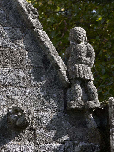 Elévation ouest, détail figure sculptée à la base du rampant sudImmatriculation