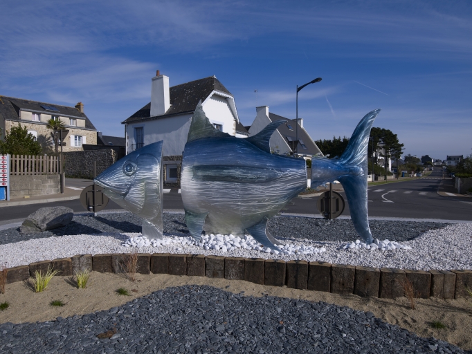 Etel, détail d'une sculpture sur un rond-point rappelant l'exploitation du thon dans la riaImmatriculation