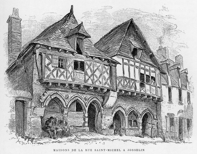 ' Maisons de la rue Saint-Michel à Josselin '. Gravure, 1891. Le 1er niveau, en pierre, de ces maisons, détruites par un incendie en 1902, a été remonté en bordure de l'OustImmatriculation