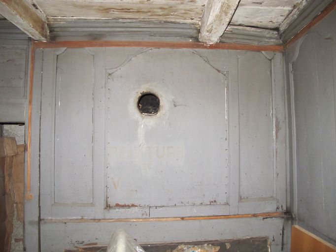 Etage de comble, pièce sud, mur ouest, cheminée lambrissée, trumeauImmatriculation