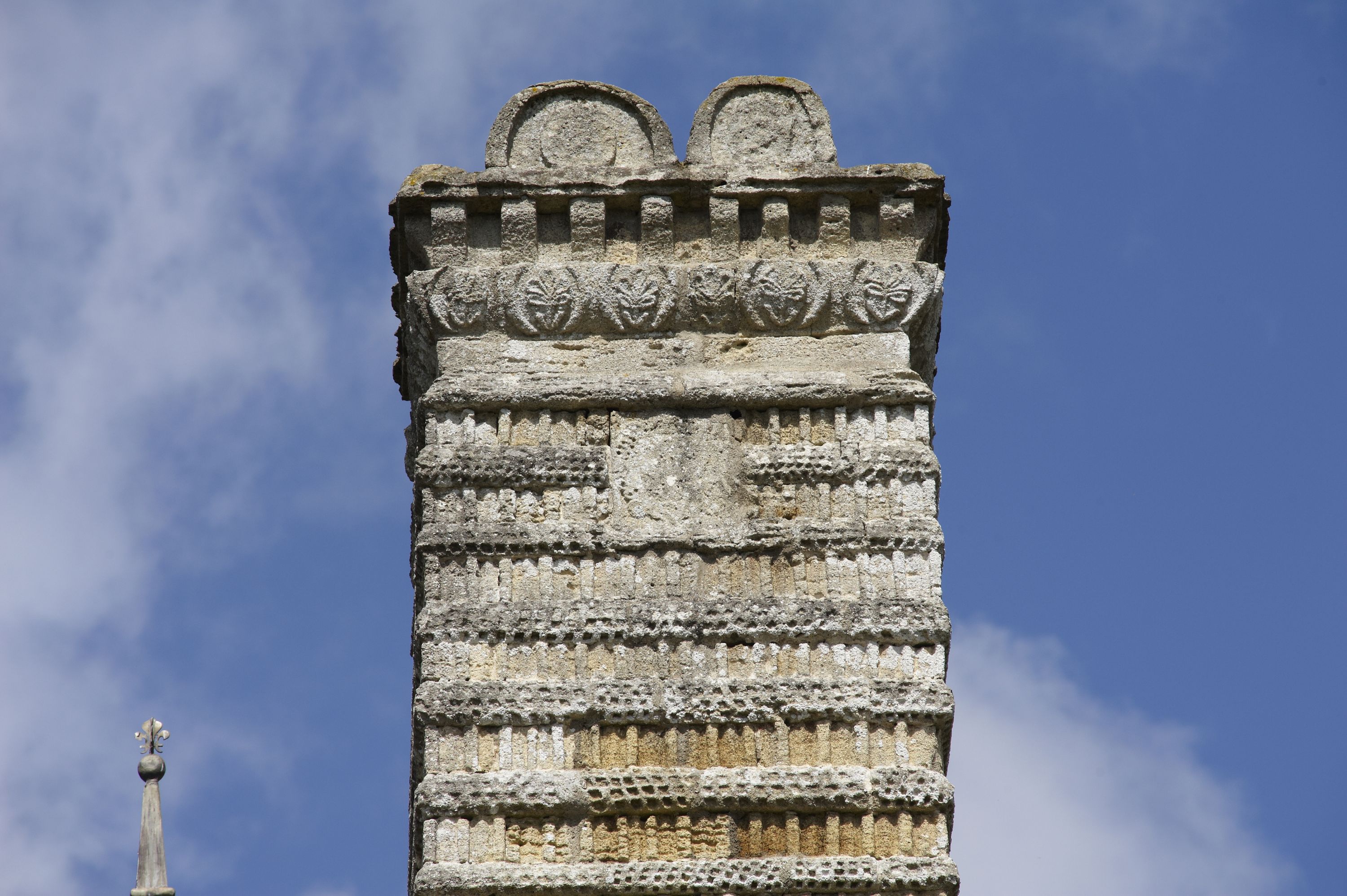 Détail : décor de souche de cheminée, bandeau avec fleur en tige, blason aux armes effacéesImmatriculation