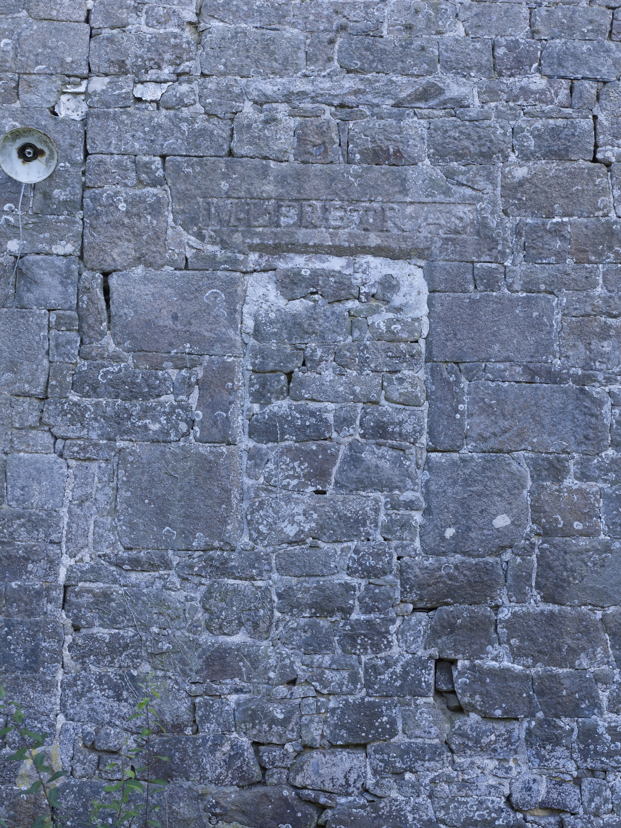 Plouaret, Guilquin : métairie noble, élévation antérieure orientée au nord. Logis ouest, porte haute : linteau portant l'inscription : M.L.PRETRAS. A droite : piedroits et linteau chanfreiné d'une fenêtre muréeImmatriculation