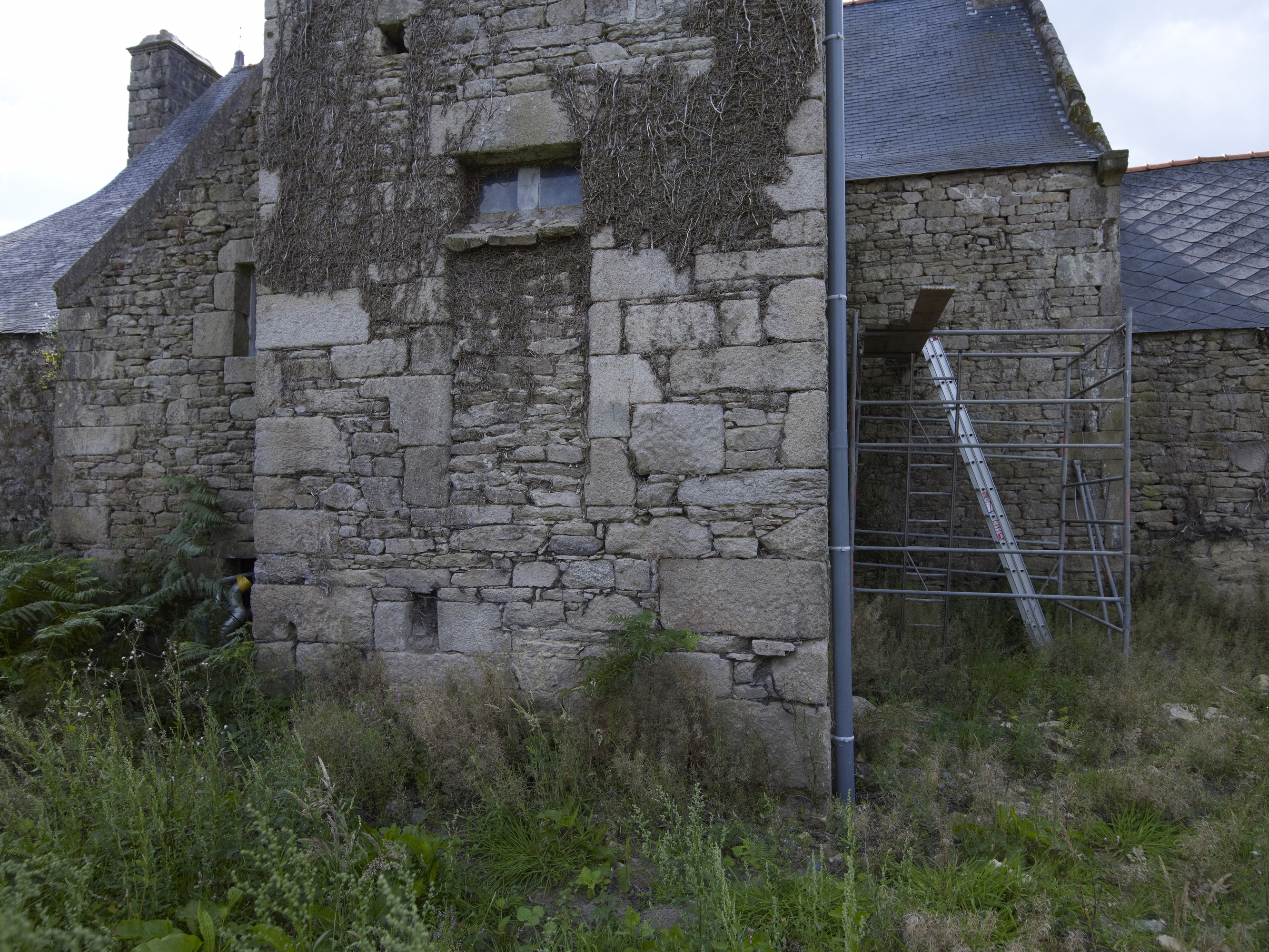 Plougras, Menez Riou : manoir, façade postérieure, tour d'escalier. Détail d'une porte muréeImmatriculation