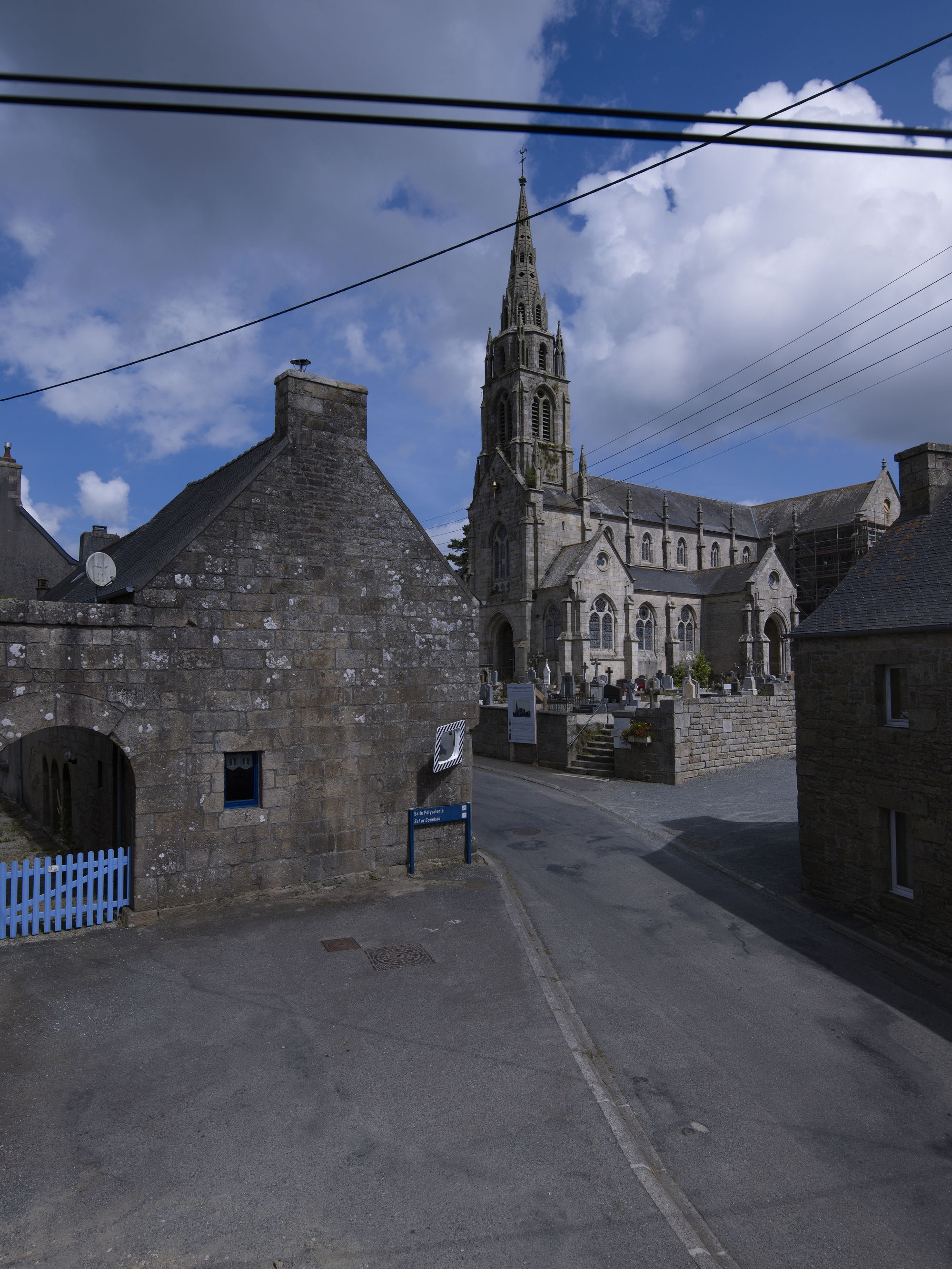 Plounérin, le bourg, rue de l'Eglise : manoir de Keraez et sa guérite. En arrière-plan : l'église paroissiale Saint-NérinImmatriculation