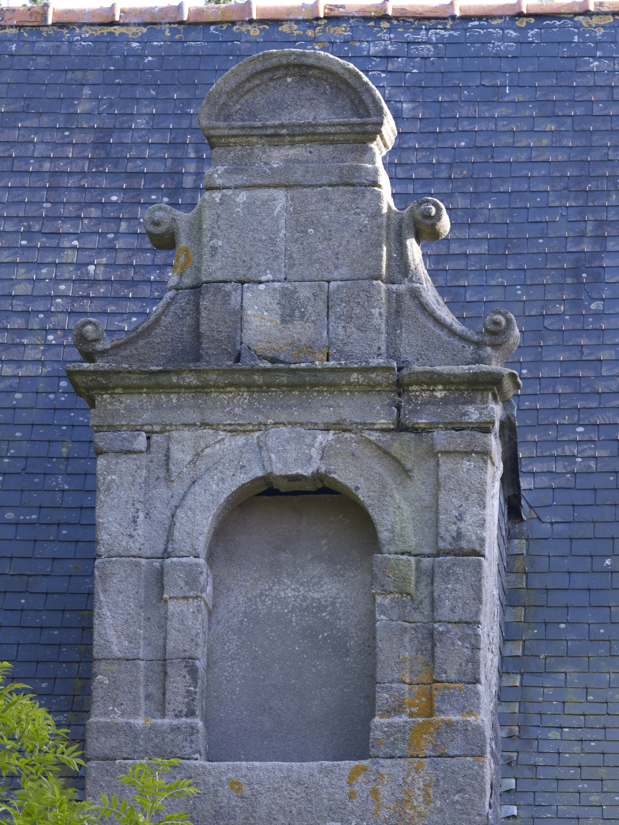 Plouaret, Guernanchanay : manoir et cour intérieure. Elévation nord, détail de la lucarne à fronton curviligne (est)Immatriculation