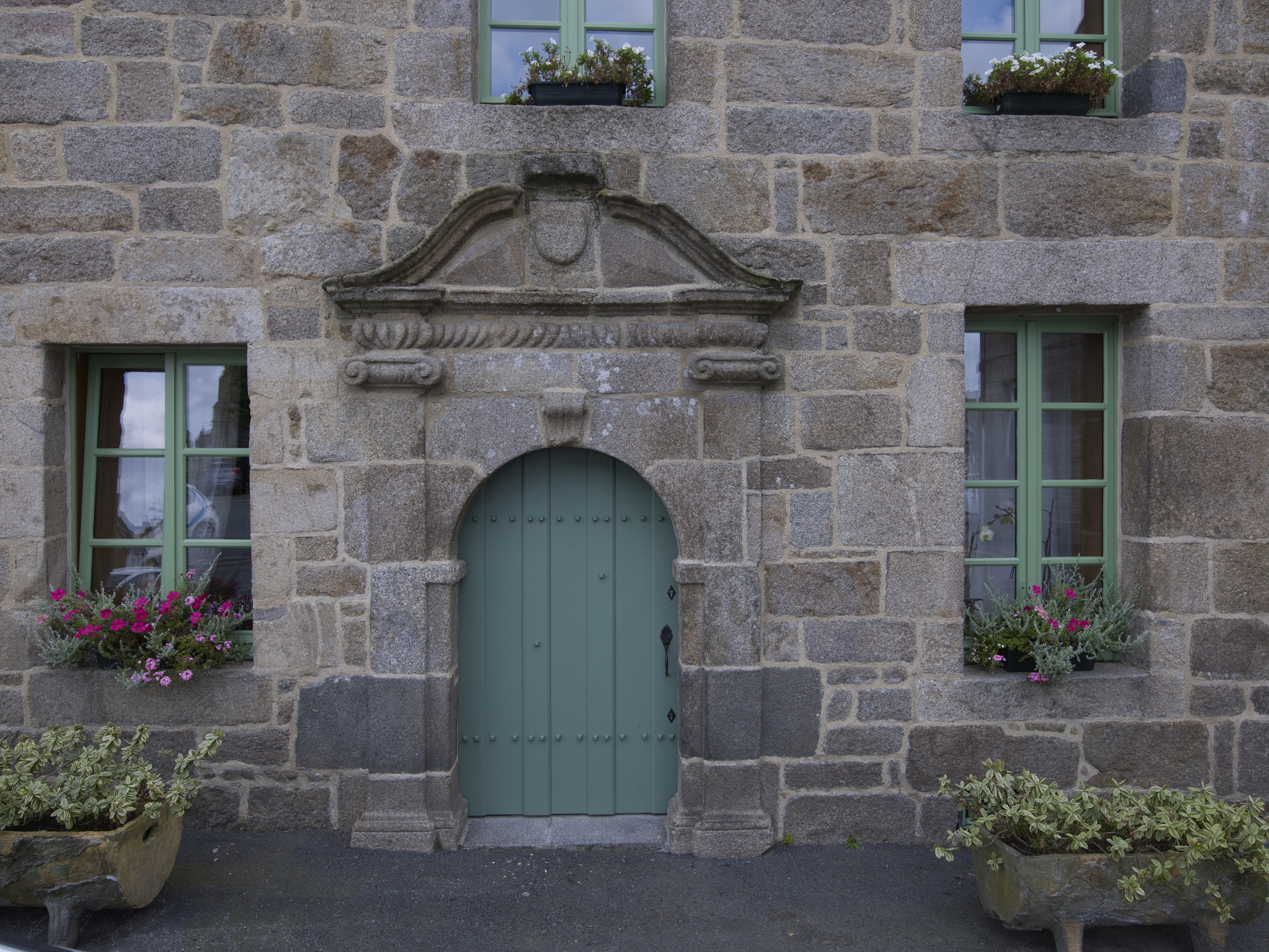 Plouaret, place de l'Eglise : maison, élévation antérieure, détail de la porte et de son décorImmatriculation