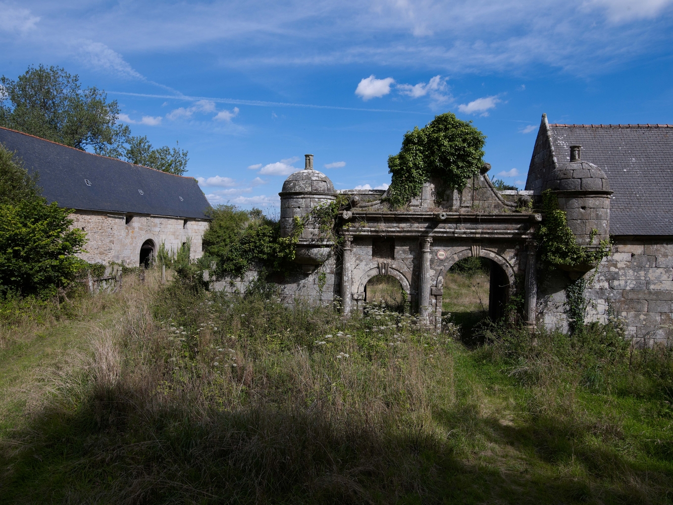 Plouaret, Guernanchanay : portail monumental du manoir comprenant une porte charretière et une porte piétonne encadrées de deux guéritesImmatriculation