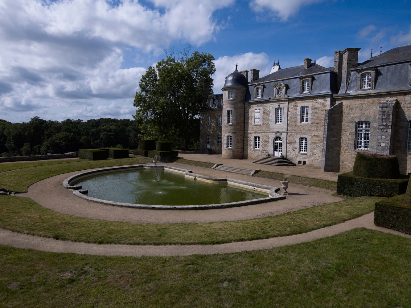 Vue de l'élévation orientée vers le sud-est. Au premier plan, le miroir d'eau. A droite, le chartrier encadré de contrefortsImmatriculation