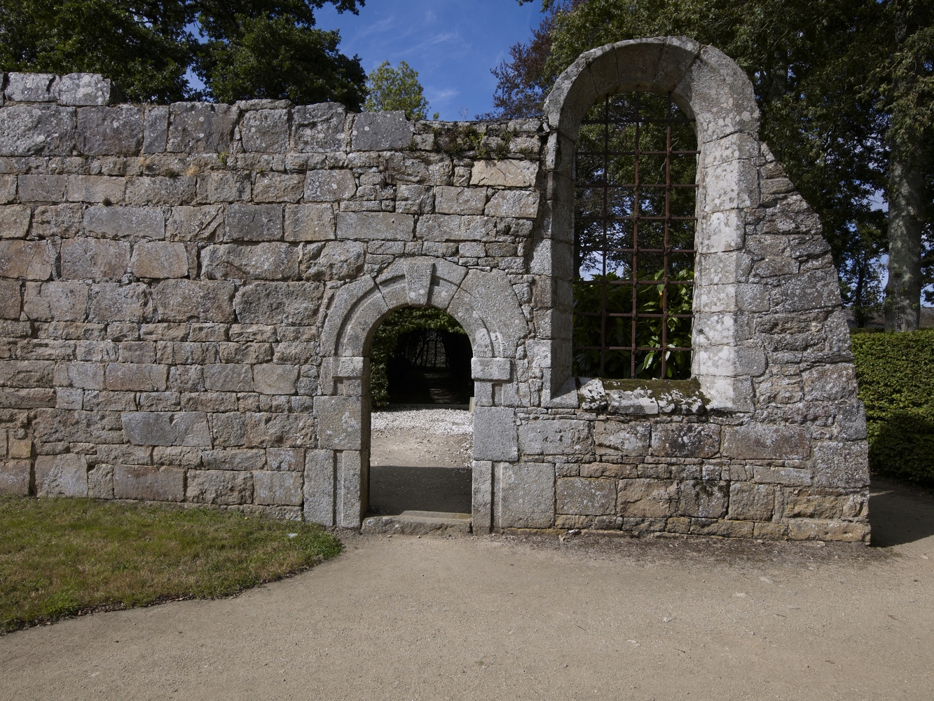 Vue des vestiges de la chapelle située au nord du château : porte sud et baie en arc plein cintreImmatriculation