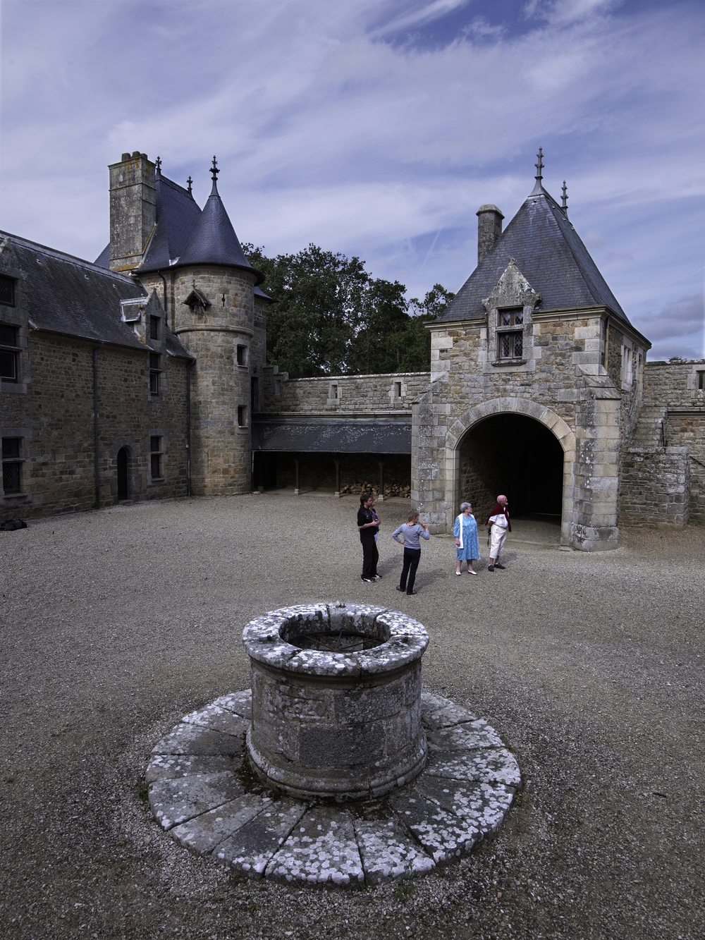Vue du pavillon abritant la porte charretière (logis-porche). Au premier plan, le puits à margelle circulaireImmatriculation