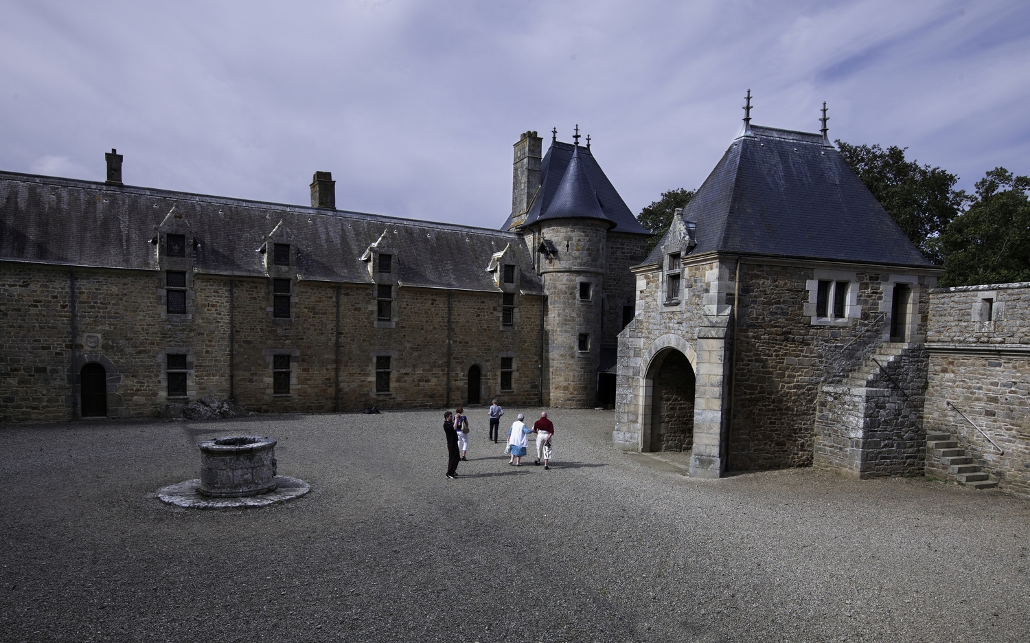 Vue de la cour. De gauche à droite : aile nord des communs, pavillon nord-est accosté d'une tour d'escalier et pavillon de la porte charretière (logis-proche)Immatriculation