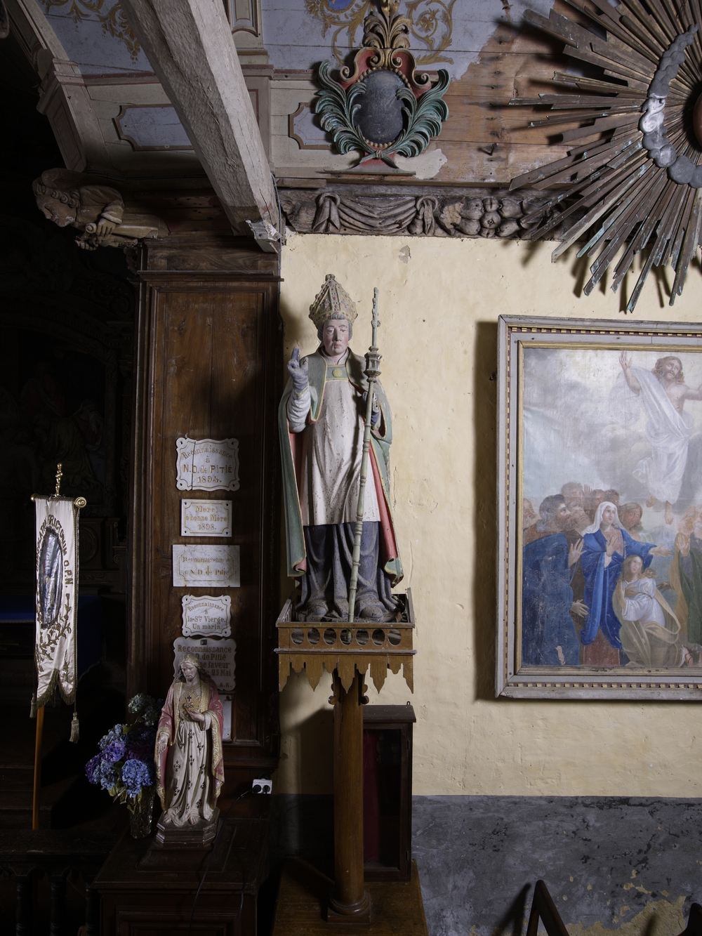 Lanvellec, Saint-Carré : chapelle Notre-Dame-de-Pitié, vue intérieure, statue d'évêqueImmatriculation