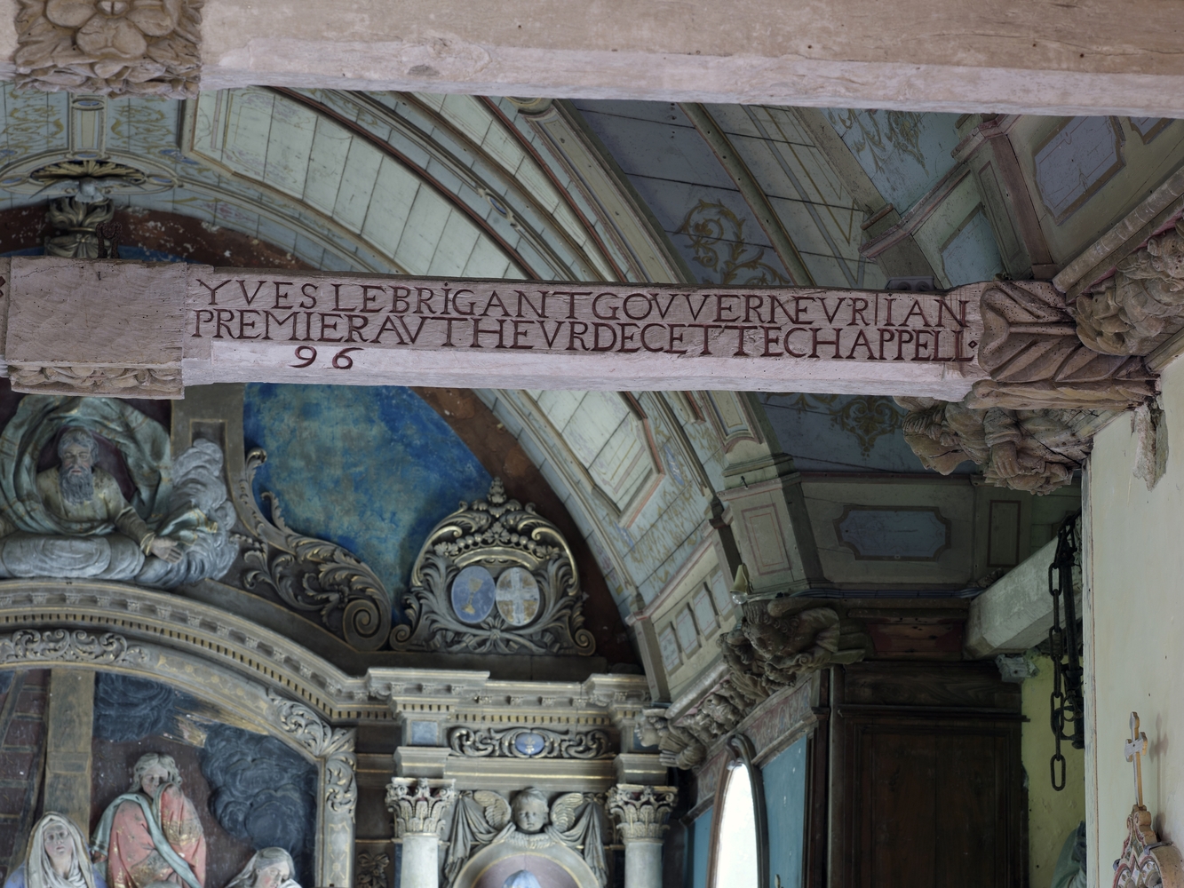 Lanvellec, Saint-Carré : chapelle Notre-Dame-de-Pitié, vue intérieure, détail de l'entrait de la nefImmatriculation