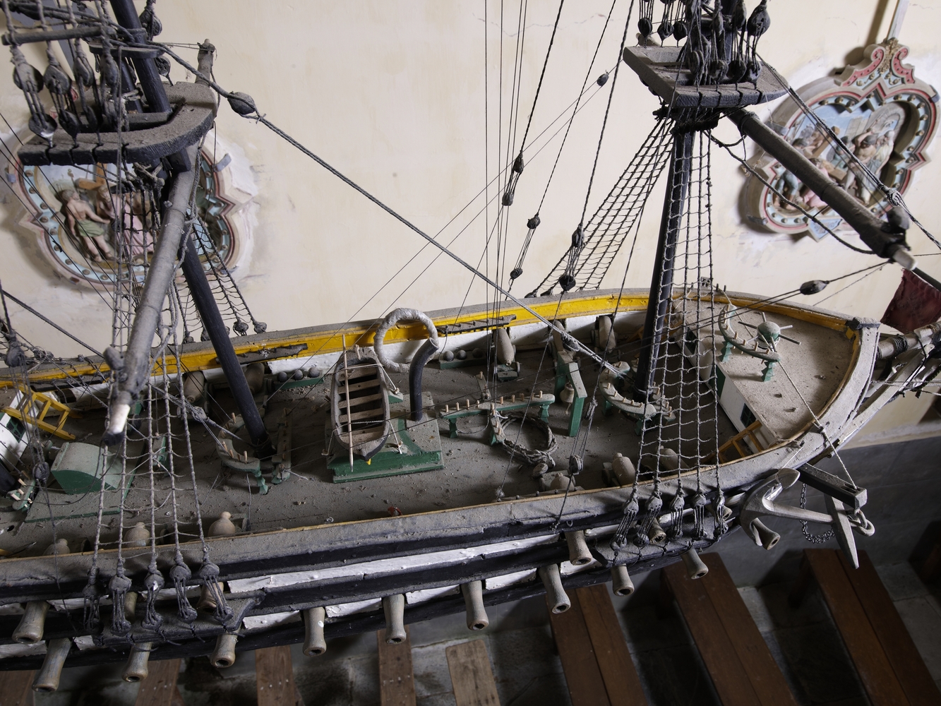 Lanvellec, Saint-Carré : chapelle Notre-Dame-de-Pitié, vue intérieure, navire de guerre à voile en ex-votoImmatriculation