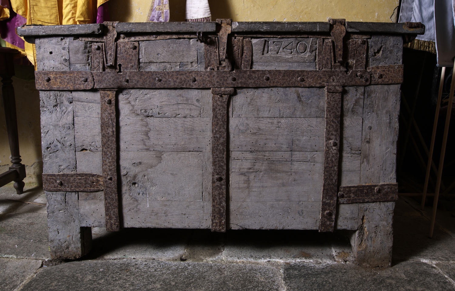 Lanvellec, Saint-Carré : chapelle Notre-Dame-de-Pitié, vue intérieure, coffre-fort de fabrique (administration des finances affectées à la construction et l'entretien d'une église ou d'une chapelle). Il porte la date 1740Immatriculation
