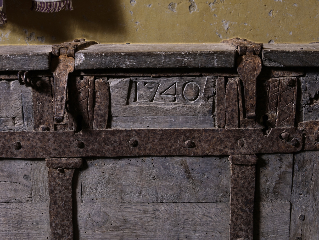 Lanvellec, Saint-Carré : chapelle Notre-Dame-de-Pitié, vue intérieure, coffre-fort de fabrique (administration des finances affectées à la construction et l'entretien d'une église ou d'une chapelle). Il porte la date 1740Immatriculation