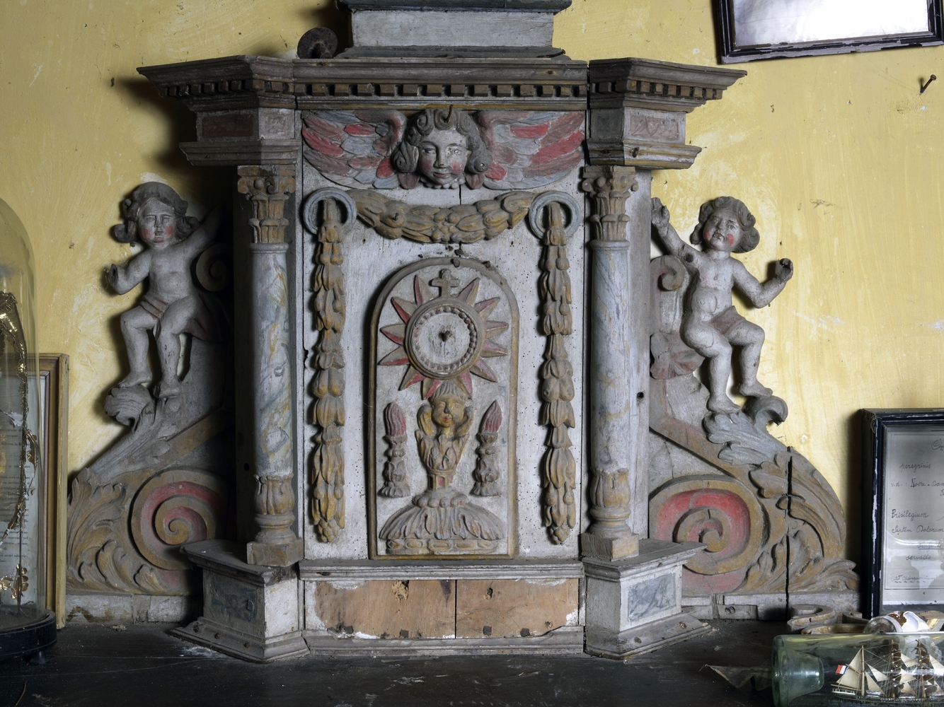 Lanvellec, Saint-Carré : chapelle Notre-Dame-de-Pitié, vue intérieure, détail de l'ancien retableImmatriculation