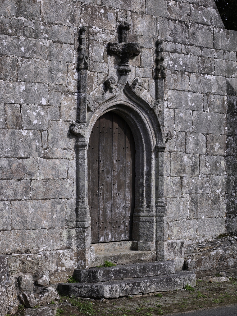 Lanvellec, Saint-Maudez : chapelle, mur-pignon ouest, porte à voussures avec arc en accolade soutenant des fleurons en croix et pinaclesImmatriculation