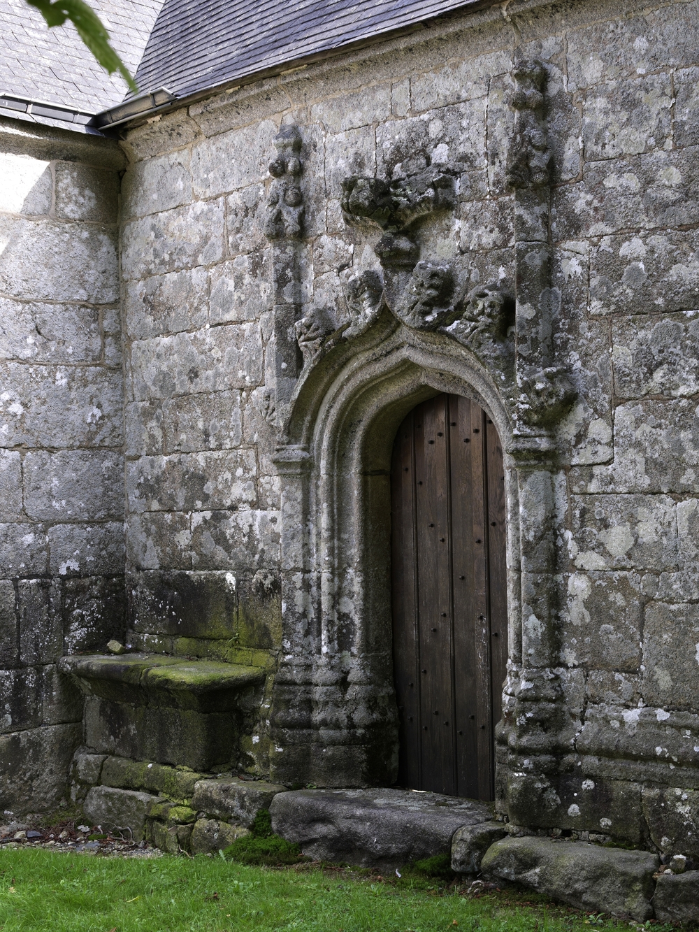 Lanvellec, Saint-Maudez : chapelle latérale au sud, porte à voussures avec arc en accolade soutenant des fleurons en croix et pinaclesImmatriculation