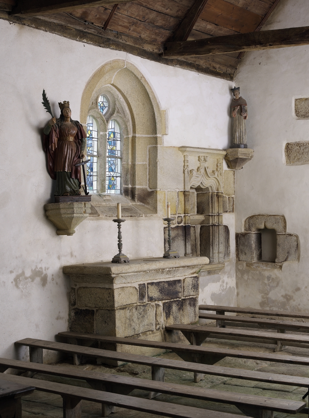 Lanvellec, Saint-Maudez : chapelle latérale sud, vue intérieure, autel et niche-crédence, baie à remplage et statue de sainte Philomène et saint YvesImmatriculation