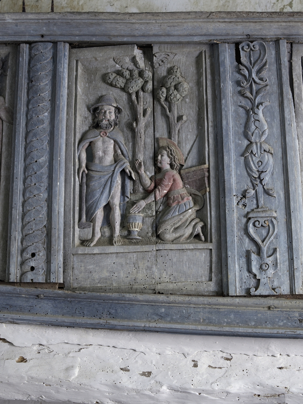 Tribune en bois polychrome, compartiment sculpté représentant des scènes de la PassionImmatriculation