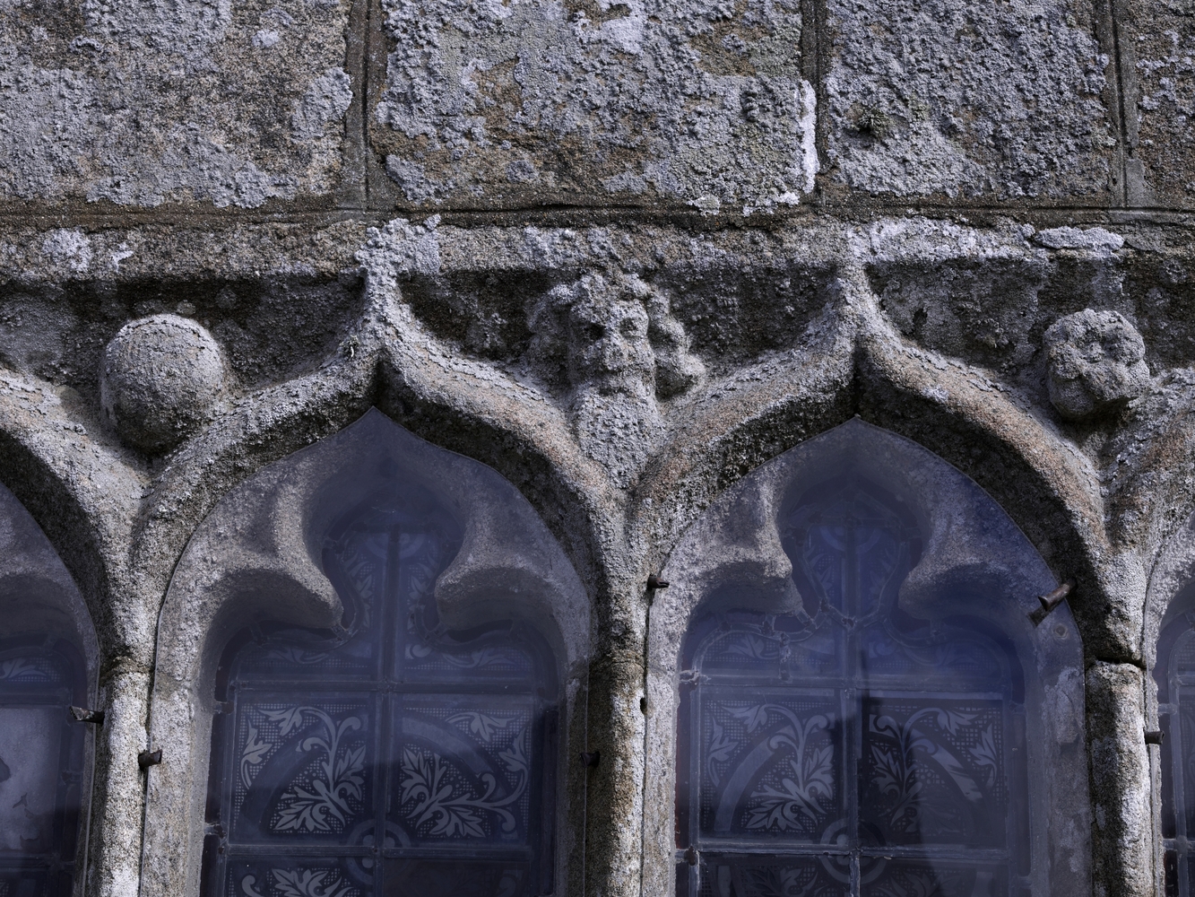 Vue de l'ossuaire d'attache en appentis : détail du décor gothique des baiesImmatriculation