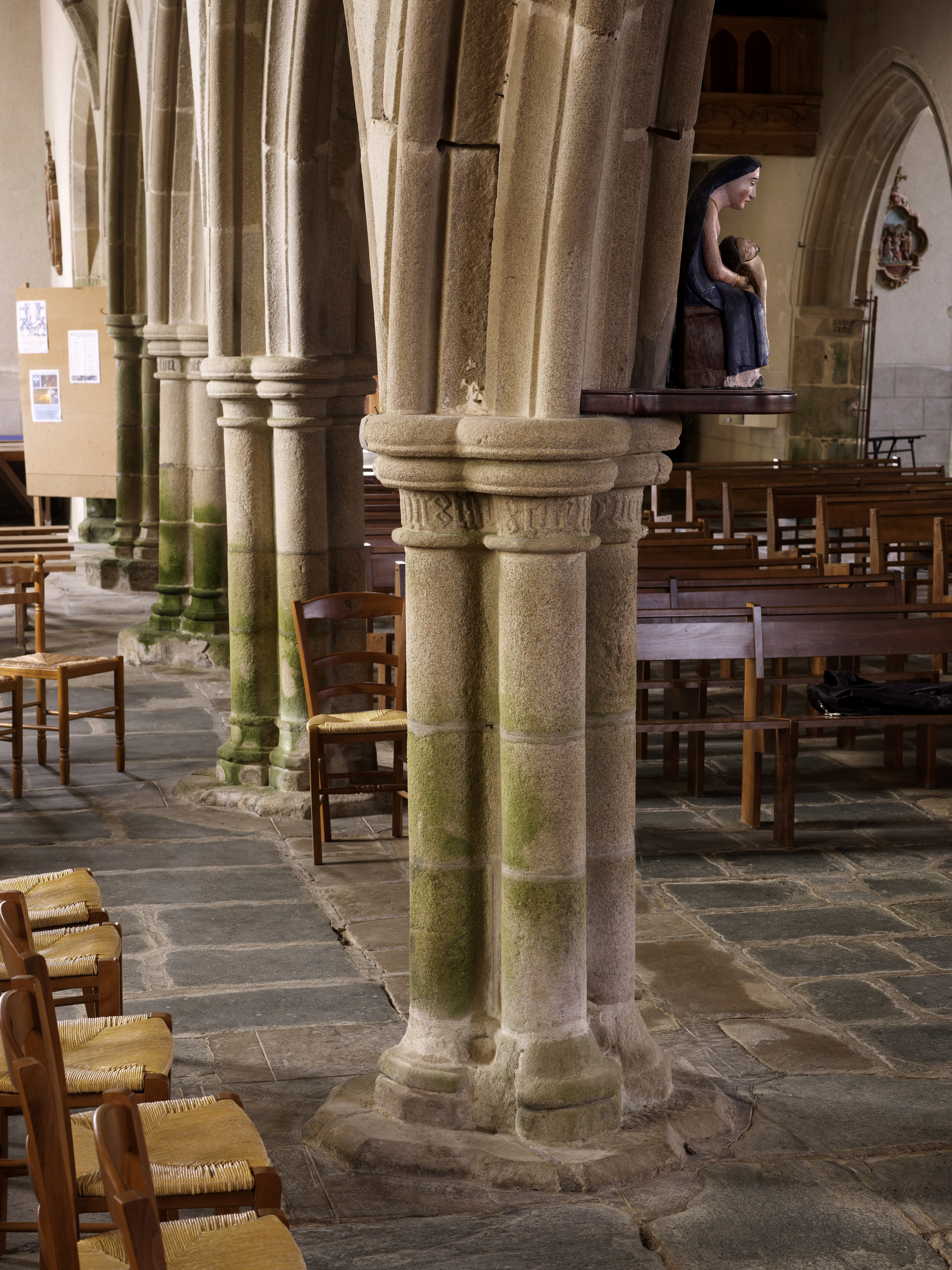 Cavan, le bourg : église paroissiale Saint-Chéron, vue intérieure, détail des piliers sud datables du 15e siècle. Deux piliers portent des noms : O. Perennes ; D. Collas ; Bouhic ; I. Doré ; Rollant Keradun ; GouverneurImmatriculation